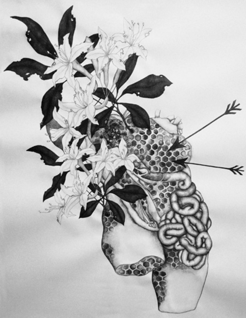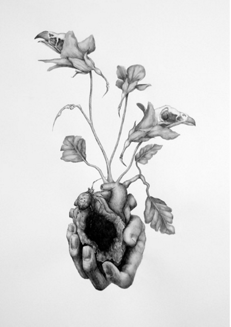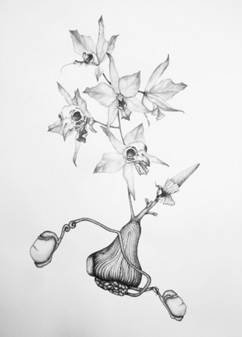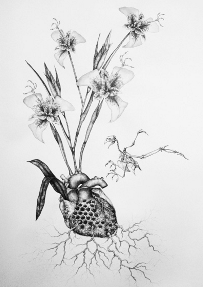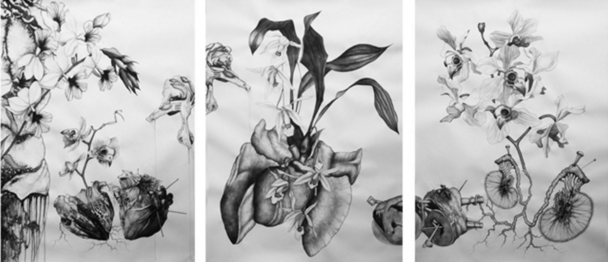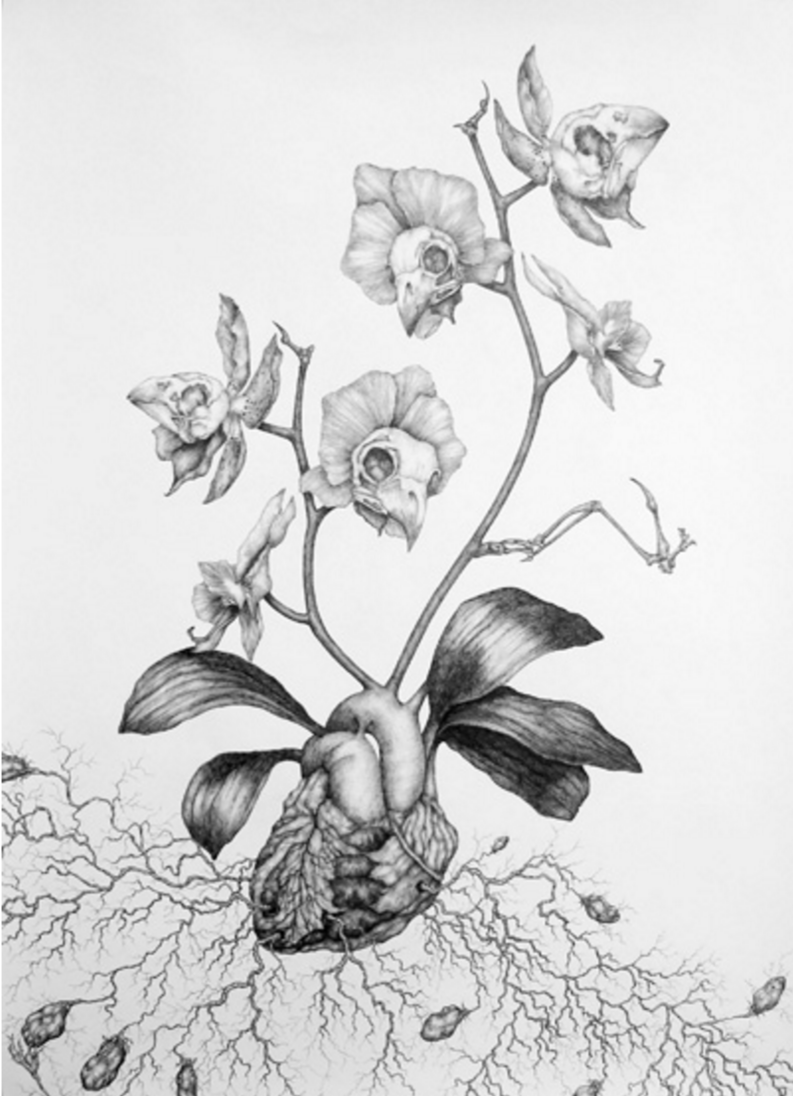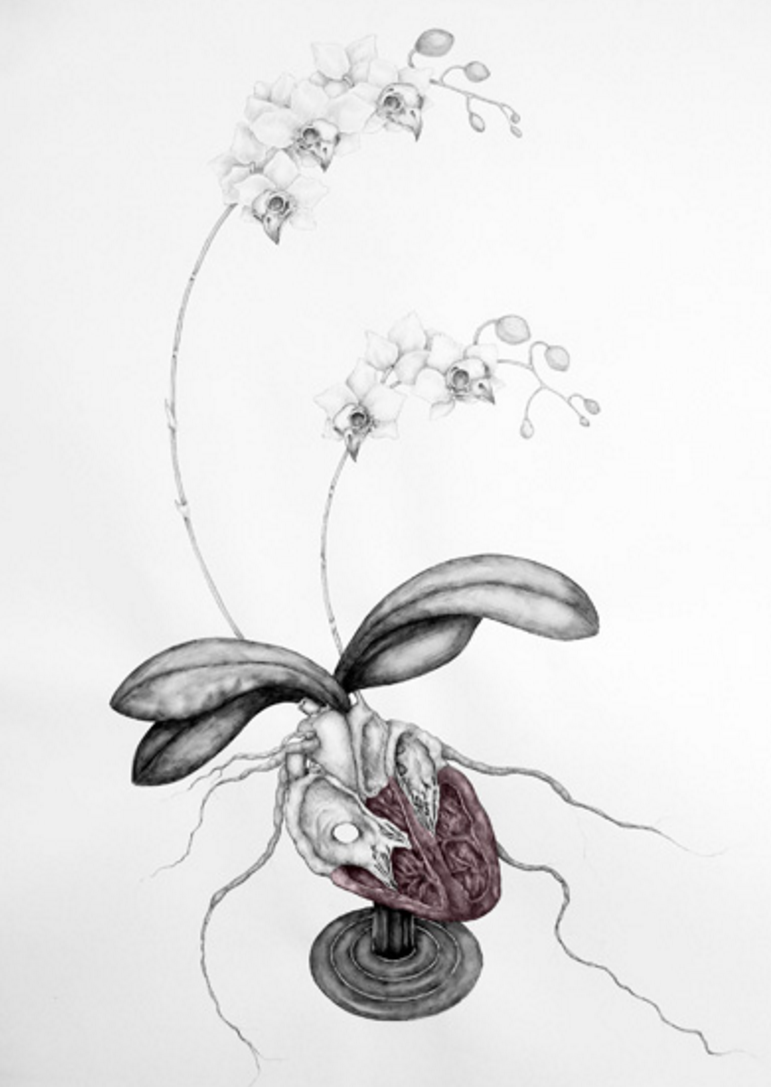 Kate uses pen to create her detailed drawings of orchids growing from organs. I referenced this as I can see links between her work and mine, for instance, I can interpret these images as the electric impulses from the heart giving life to the growing orchid. Although this might not be the case it creates a link that fits with my theories. My favourite thing about her work the precision and detail of her technique. I feel that this high level of standard really adds to the image and allows the two types of organism to combine in a totally natural way. Her works have inspired my theories and ideas, helping me develop and move forward in my work by combining old and new work to form an image made up from two parts.